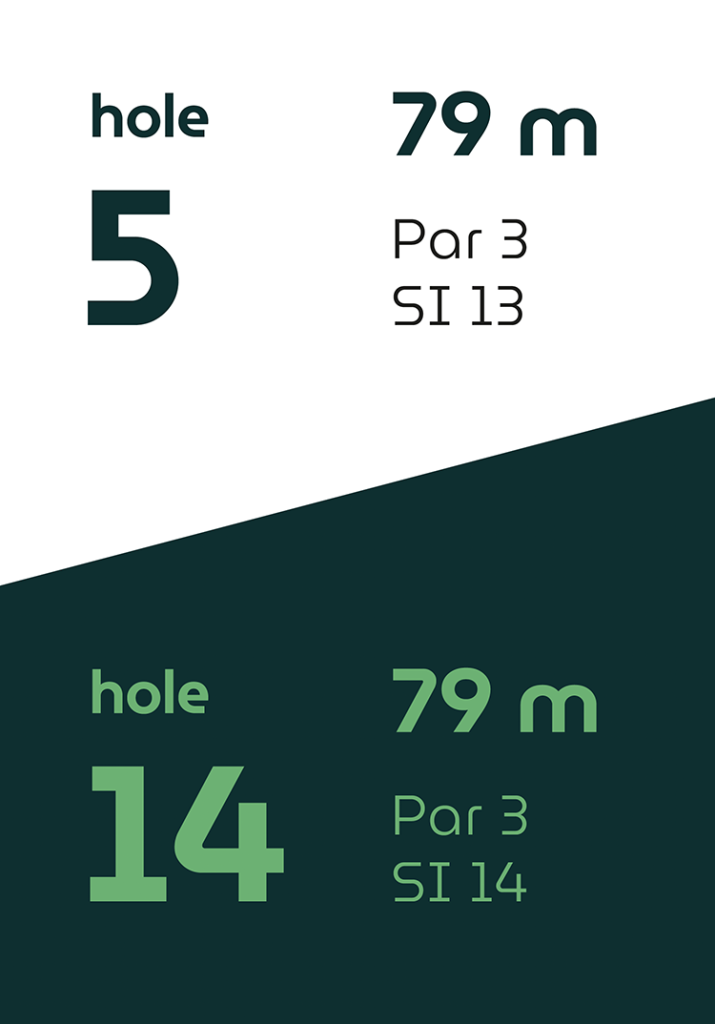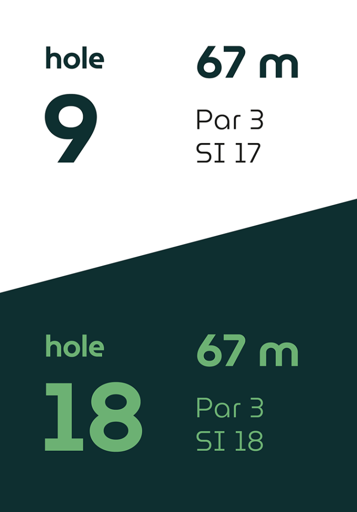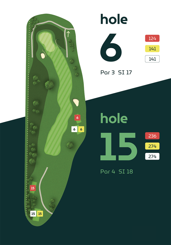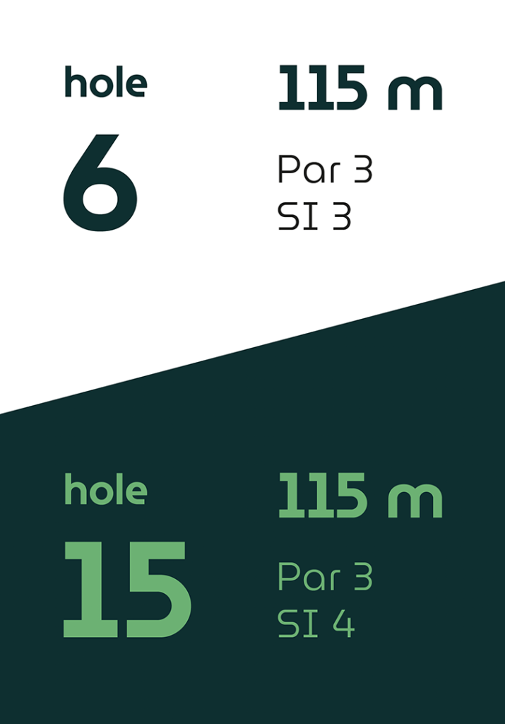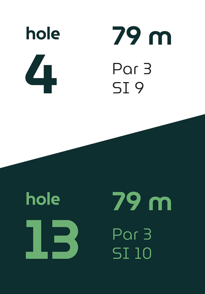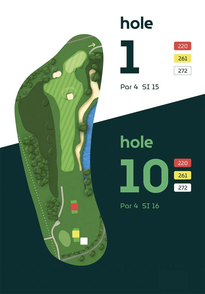 Op vier holes verschillen de afslagplaatsen, waardoor de eerste en tweede 9-holes ronde ieder hun eigen karakter hebben.