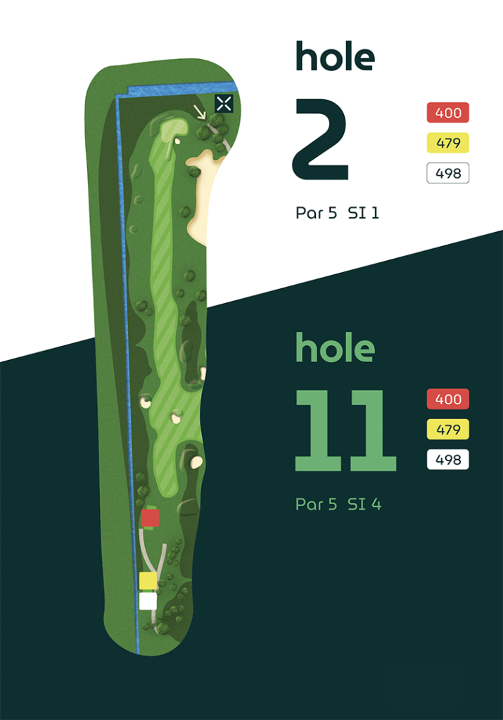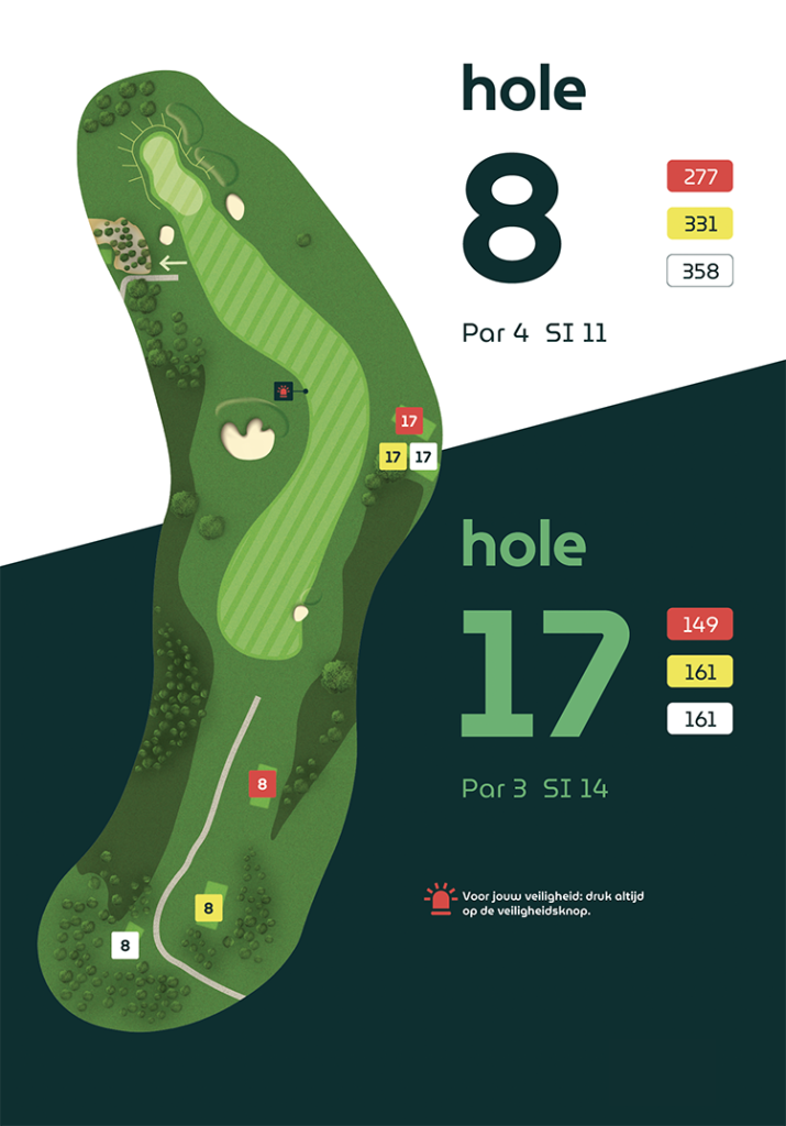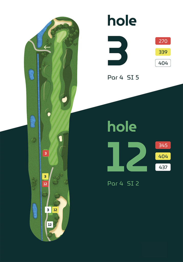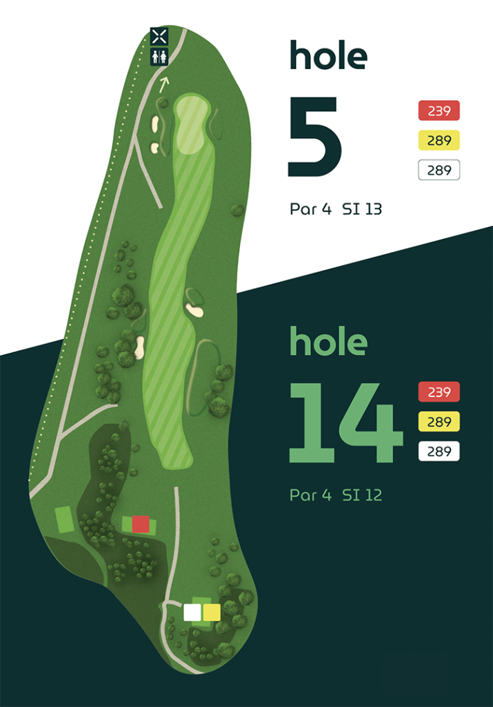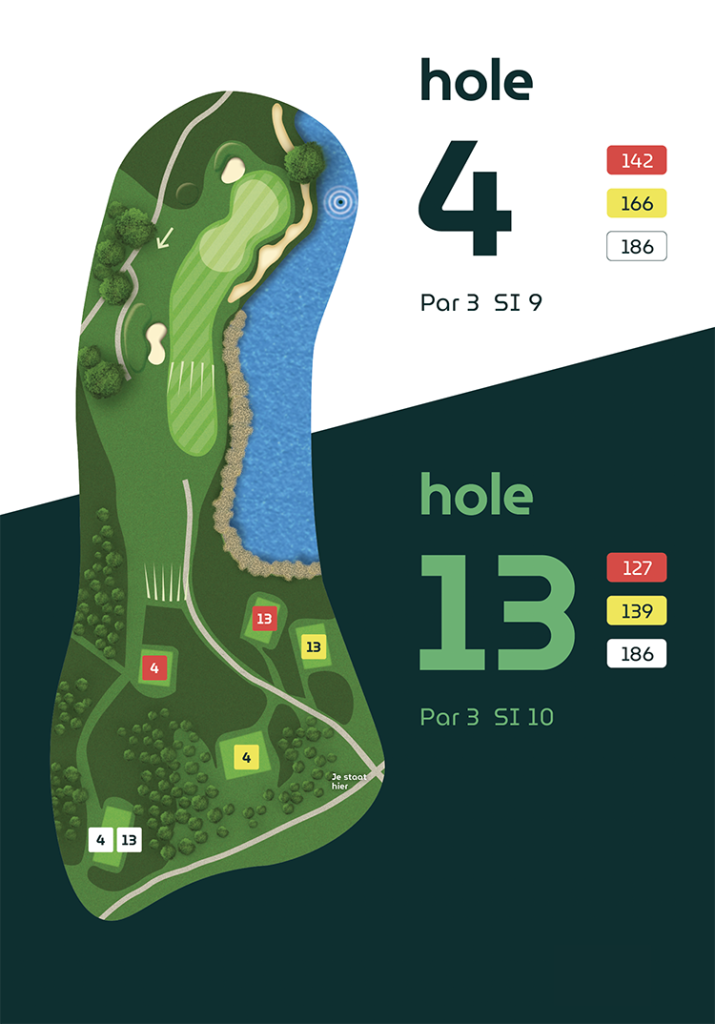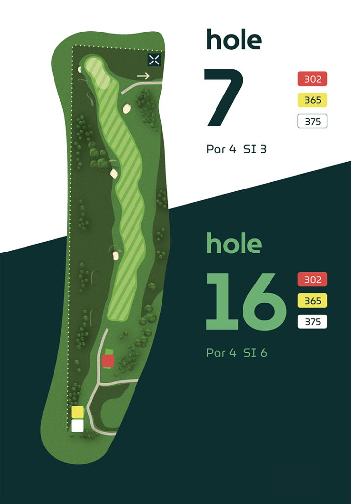 Op vier holes verschillen de afslagplaatsen, waardoor de eerste en tweede 9-holes ronde ieder hun eigen karakter hebben.